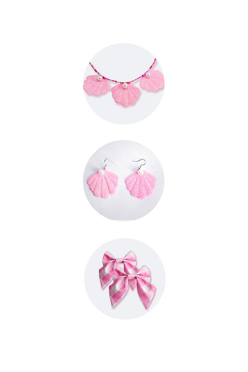 This Pink Gingham Beach Doll costume includes a pink gingham mini dress with a scalloped hemline, attached bow, hair bows, and seashell jewelry.