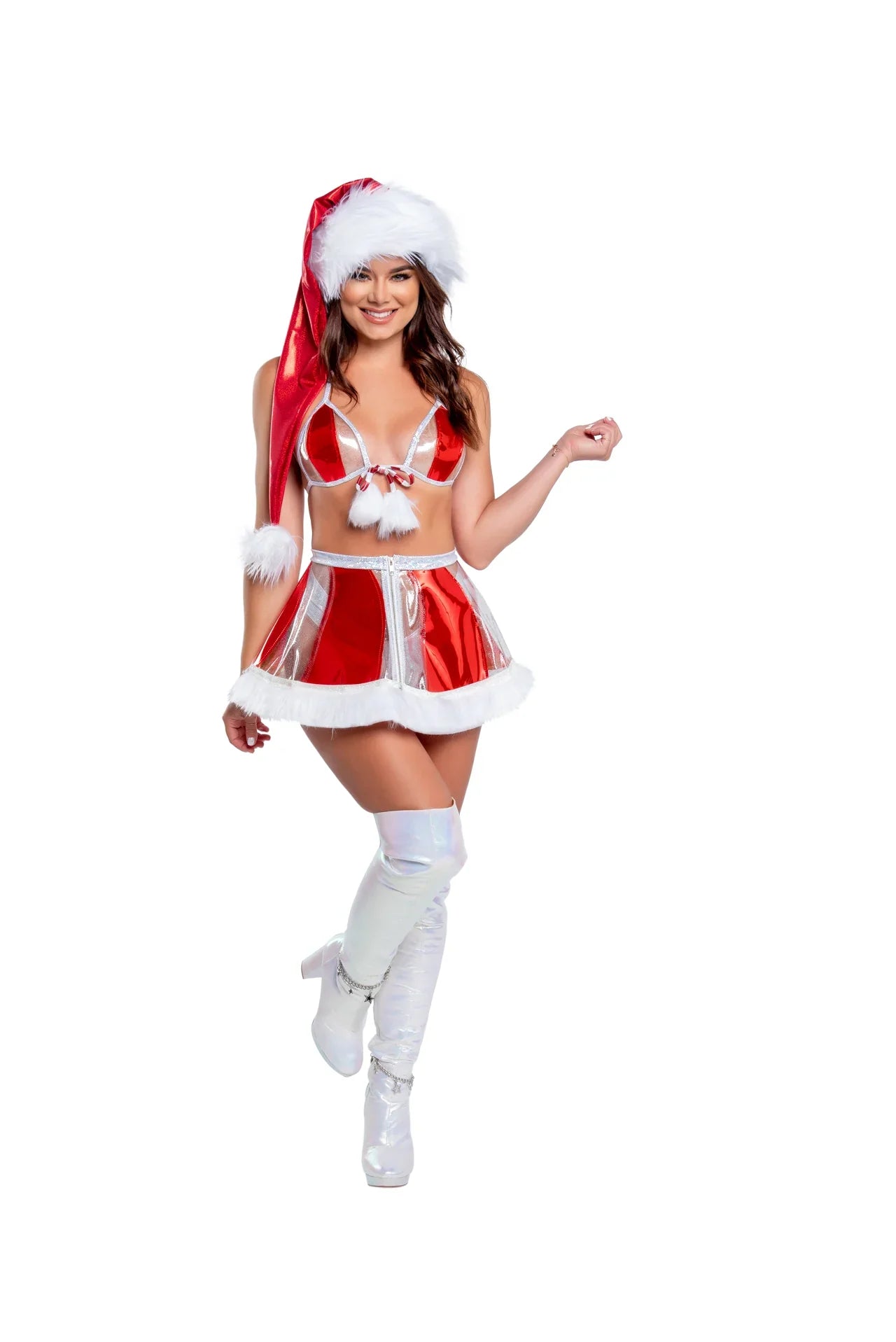 This two-toned, vinyl skater skirt features faux fur trim and a high waisted silhouette.